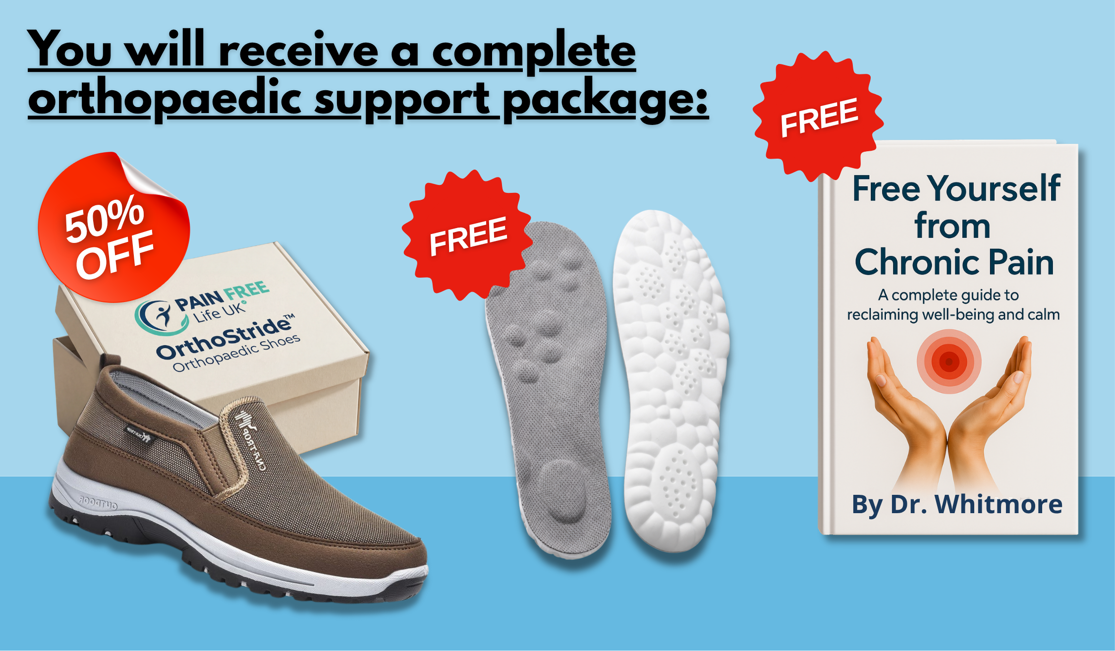 That’s why we’ve created a complete orthopaedic support package with OrthoStride™ shoes, OrthoFlex™ insoles and a complete guide written for you, to help you move with comfort, confidence and stability every single day.